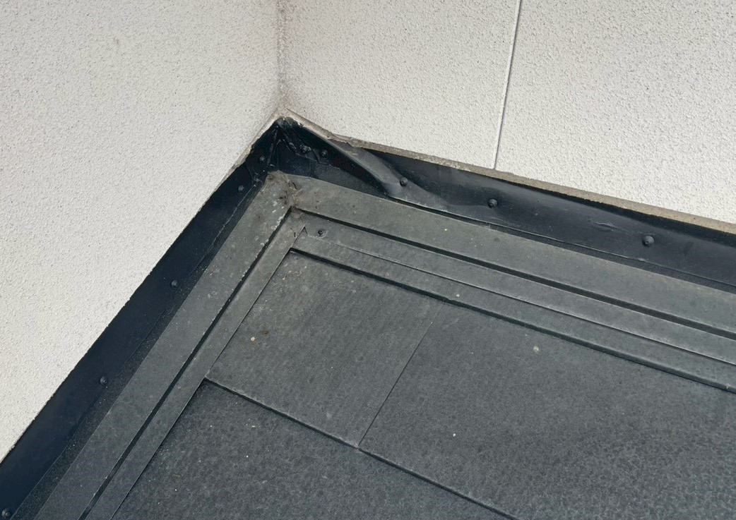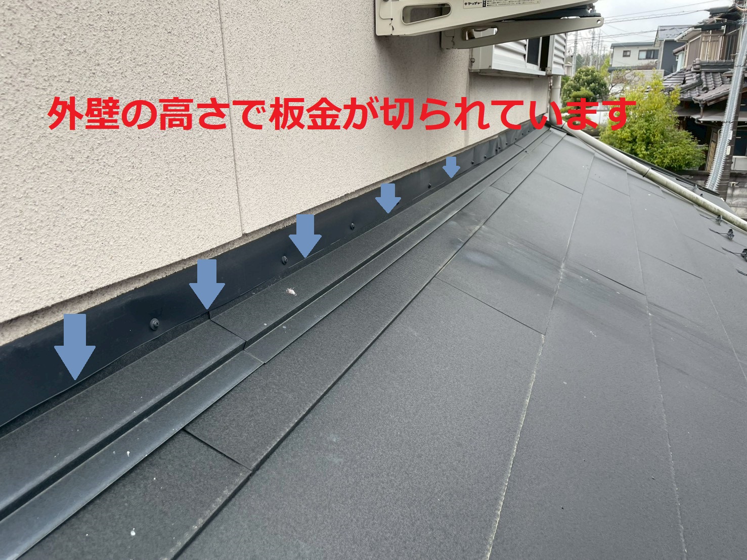 ご相談のきっかけは、一階の屋根(下屋)と外壁の取り合い(接合部)に付いている雨押え板金が小さく、外壁の高さで切断された状態で設置されていた点でした。雨押え板金とは、屋根と外壁の接合部に取り付けられる板金部材のことです。 一番の役割は、外壁と屋根の隙間から雨水が建物内部に侵入するのを防ぐこと。 よって、この部分が正しく設置されていないと、雨水を屋根面へ十分に誘導しづらく、強風時の吹き上げ雨が外壁の中へ入り込みやすい納まりになってしまいます。もし壁内へ水が回ると、貫板などの下地や建物側を傷める原因にもなり得るため、早めに手を打っておきたいというお気持ちが強かったようです。角や曲線に成形されている既存の板金も、経年で浮きや変形が見られ、雨漏りにつながりかねない状況だったことから、相談のうえ正式な雨押え板金をカバーで設置する方向でご依頼をいただきました。