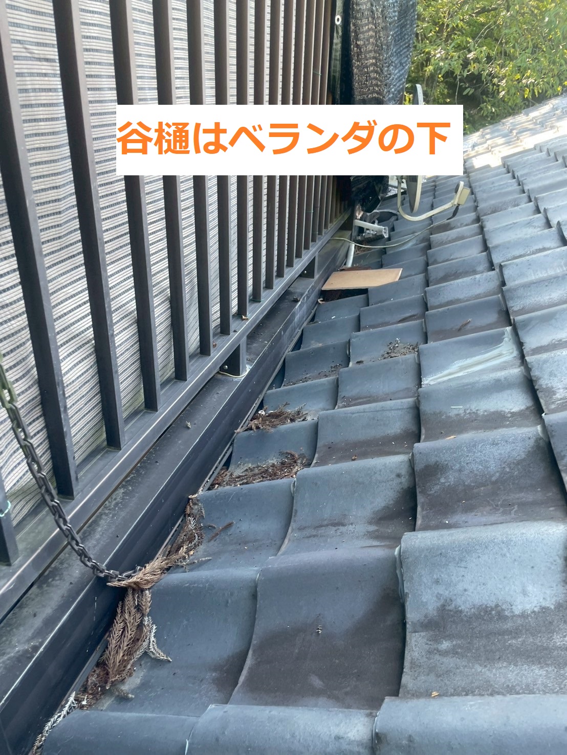 ご相談は「ベランダの下にある谷樋が気になるが、自分では見えないし掃除もできない」というお困りごとから始まりました。谷樋は屋根面の雨水が集中する排水ルートなので、少しの堆積でも流れが悪くなると影響が出やすいのが特徴です。こちらの谷樋は大部分がベランダ下に隠れており、大きな飛来物はベランダの鉄骨に引っかかりやすい反面、露出している部分には土砂や落ち葉が溜まりやすい状況でした。さらに、点検の間隔が空いていると、堆積物に紛れて屋根材の欠けなども見逃しやすくなります。そこで街の屋根やさんが現地で状態を確認し、清掃とあわせて必要箇所の補修も行う流れとなりました。